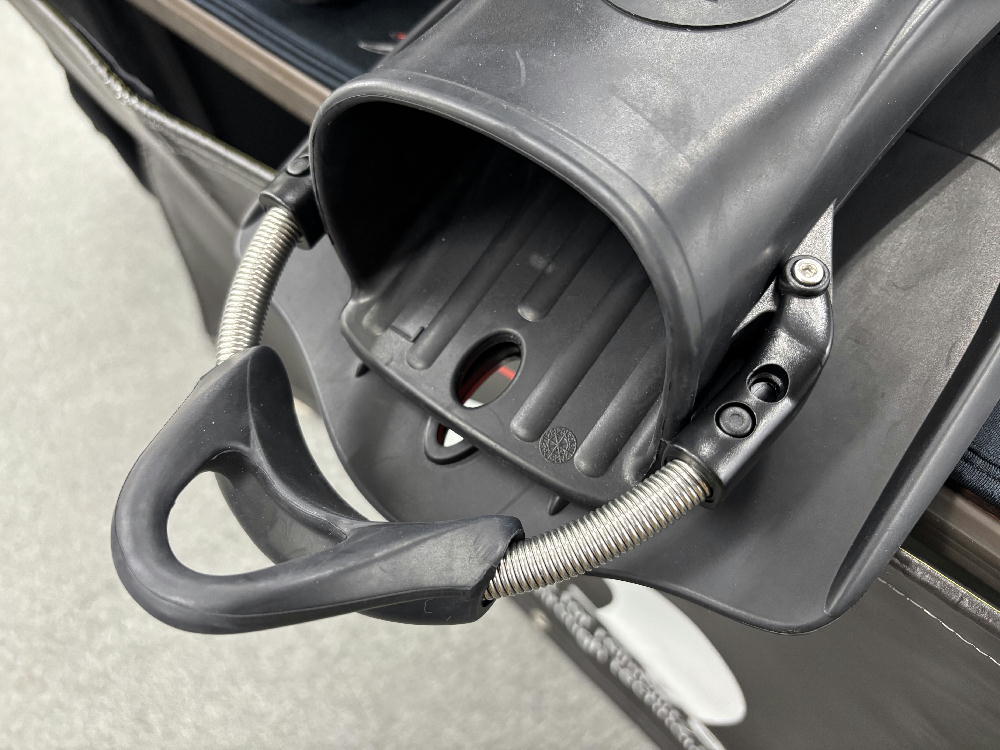 今回、気になった商品はフィンです。某メーカーさんのフィンに似てますね。素材はゴム製でストラップはバネ式を採用していて、ストラップの長さを微調整でき様にバネの止め口を2ケ所になっています。参考出品になっていますが。発売される予定になっている様です 。脚力に自身のあるダイバーにはおすすめです。